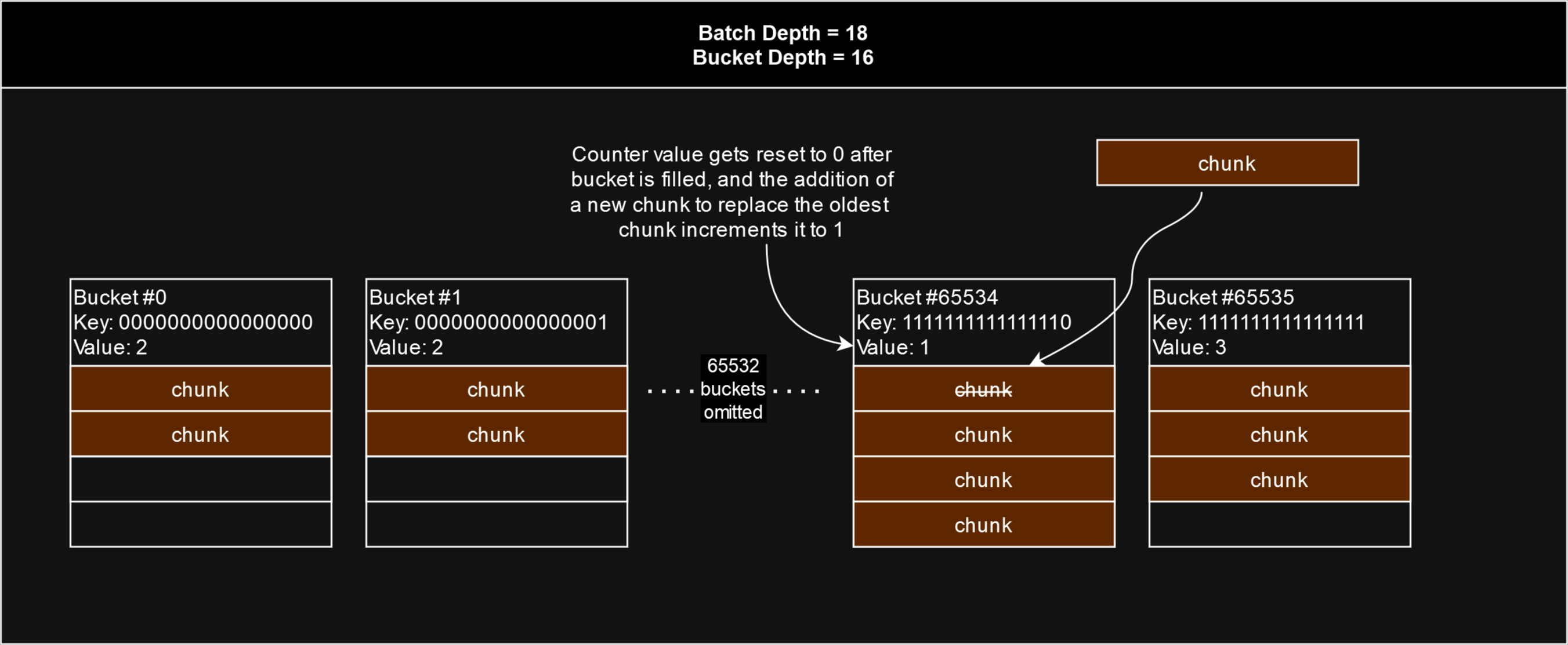 As chunks are uploaded to Swarm, each chunk is assigned to a bucket based the first 16 binary digits of the chunk's hash. The chunk will be assigned to whichever bucket's key matches the first 16 bits of its hash, and that bucket's counter will be incremented by 1.